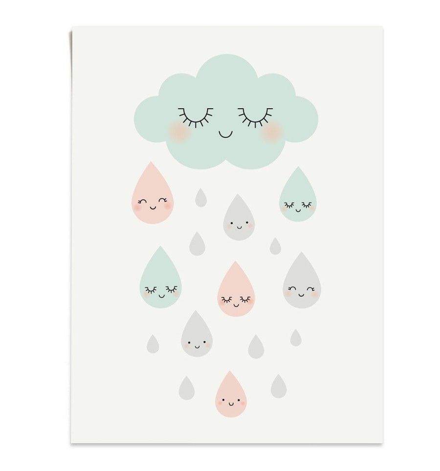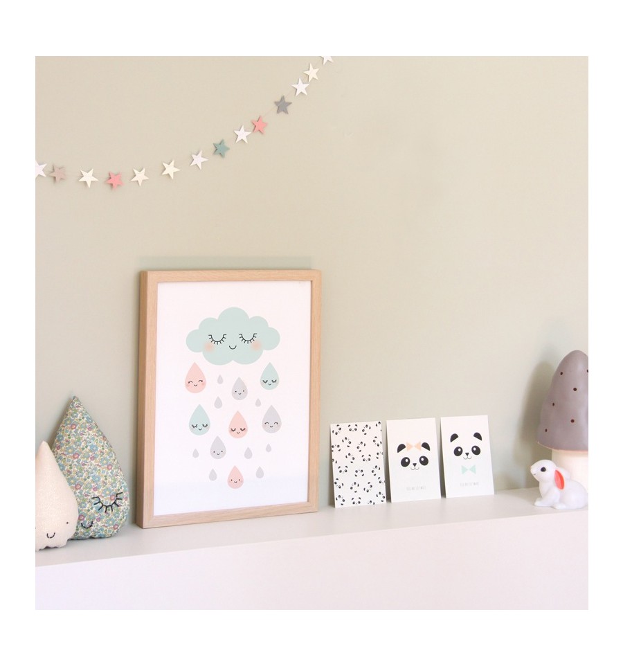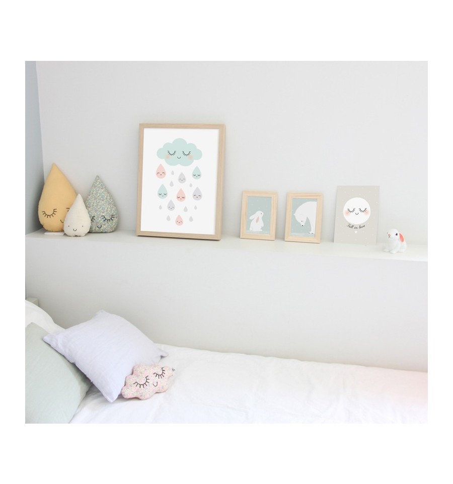 L'affiche douce pluie de Zü, avec le célèbre nuage aux yeux fermés et au sourire radieux de la créatrice qui décore la chambre dans des teintes pastel très actuelles.