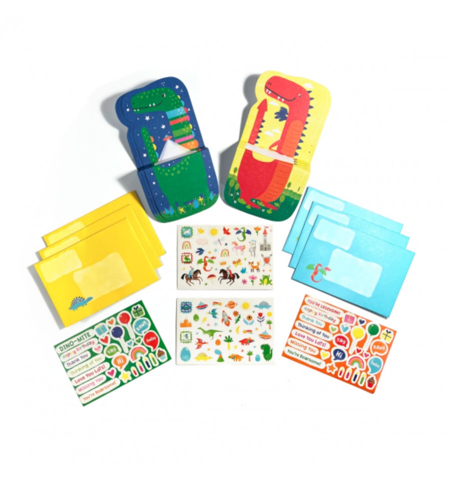 - 6 enveloppes (jaune avec un dino et bleue avec un dragon cracheur de flammes)