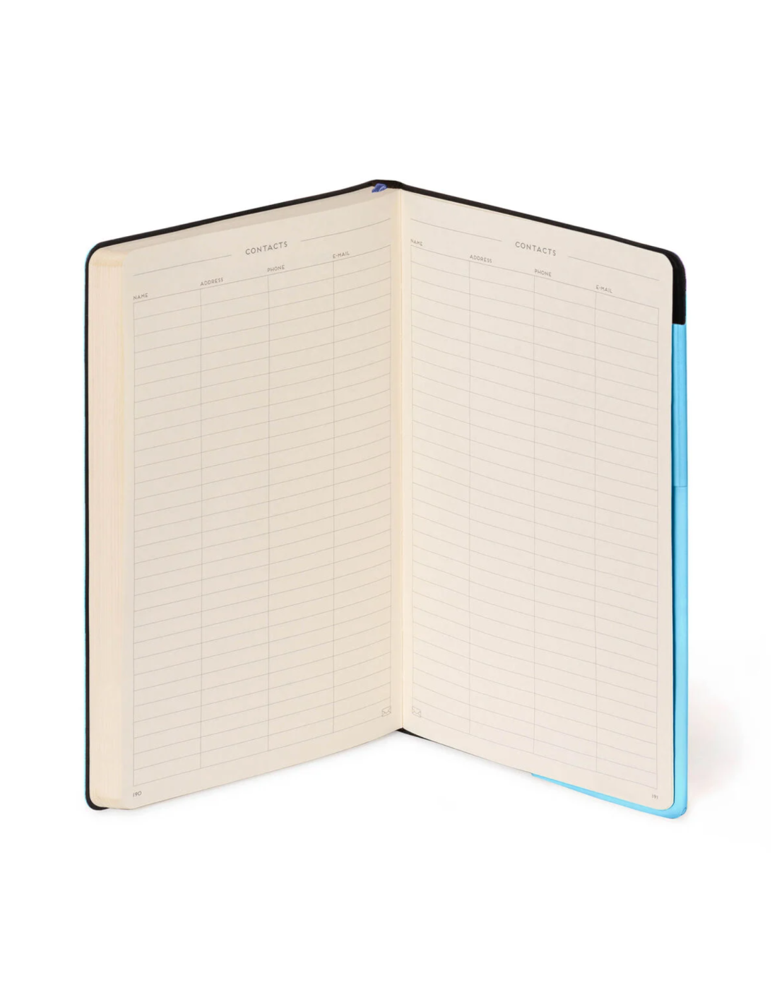 Comprend les pages suivantes : index, carte du monde, objectifs annuels, planner sur 12 mois, contacts, mot de passe, pochette rabat à la fin du carnet.