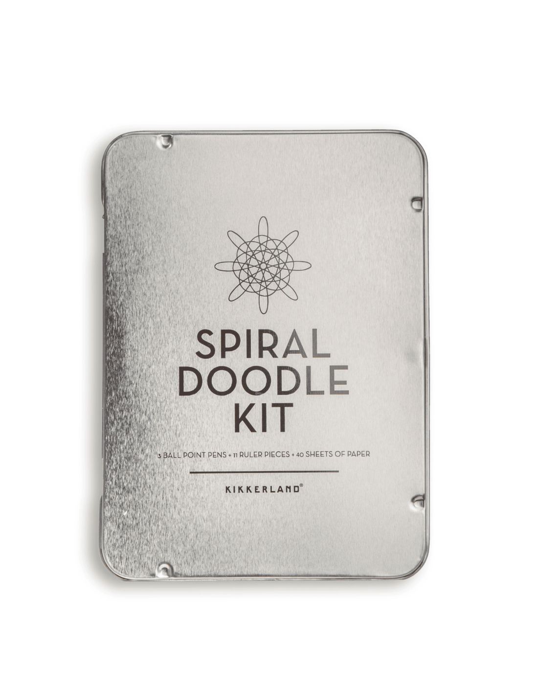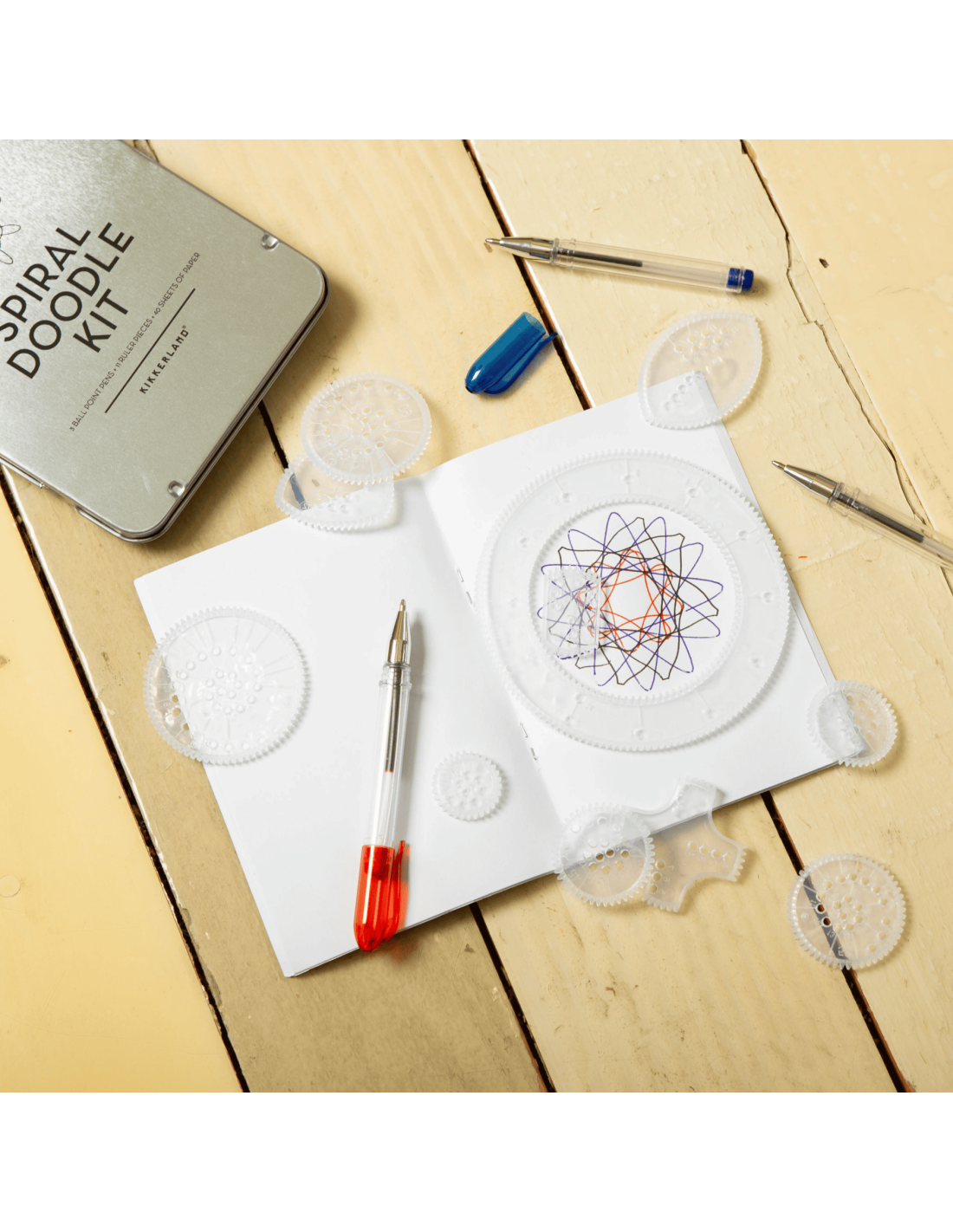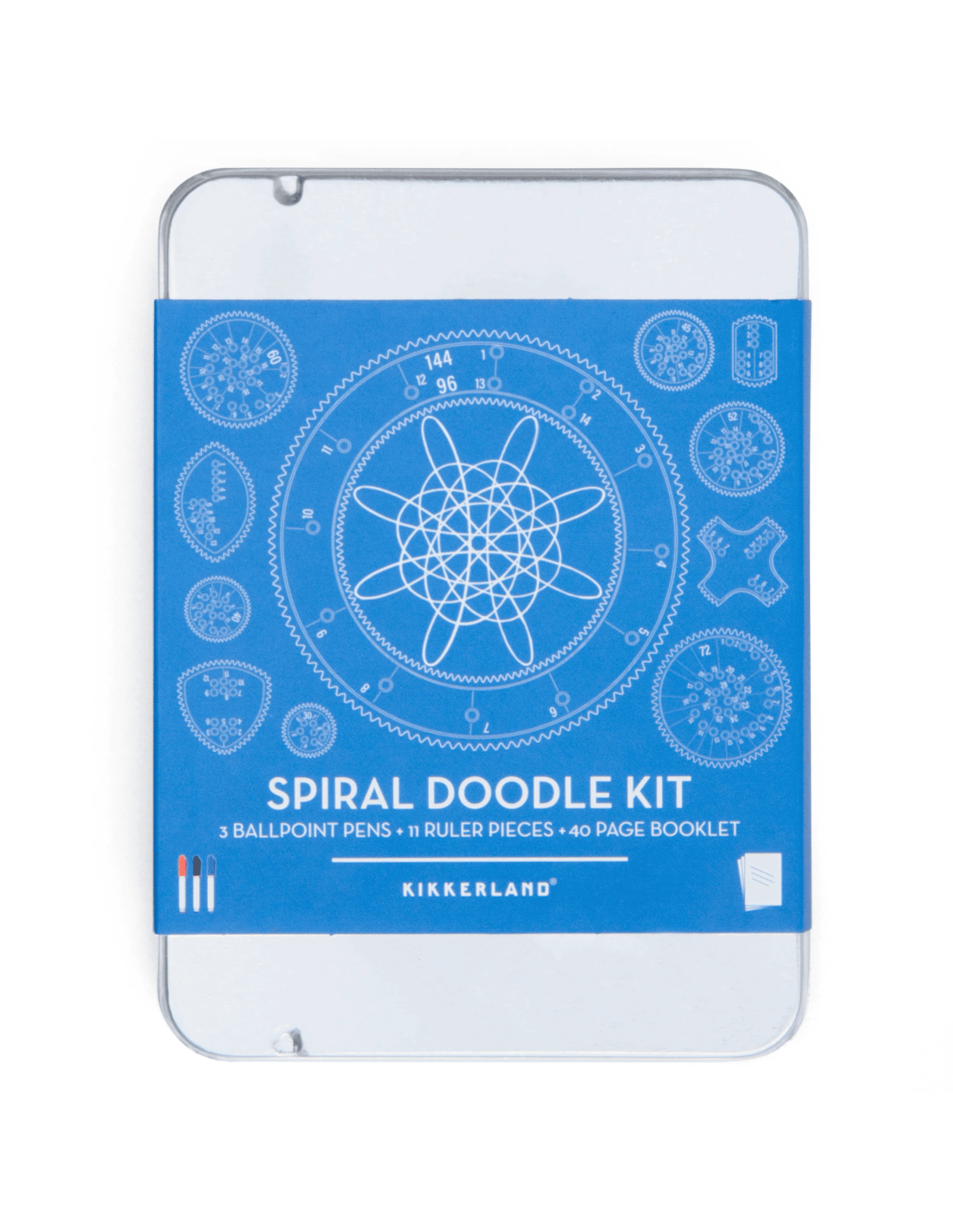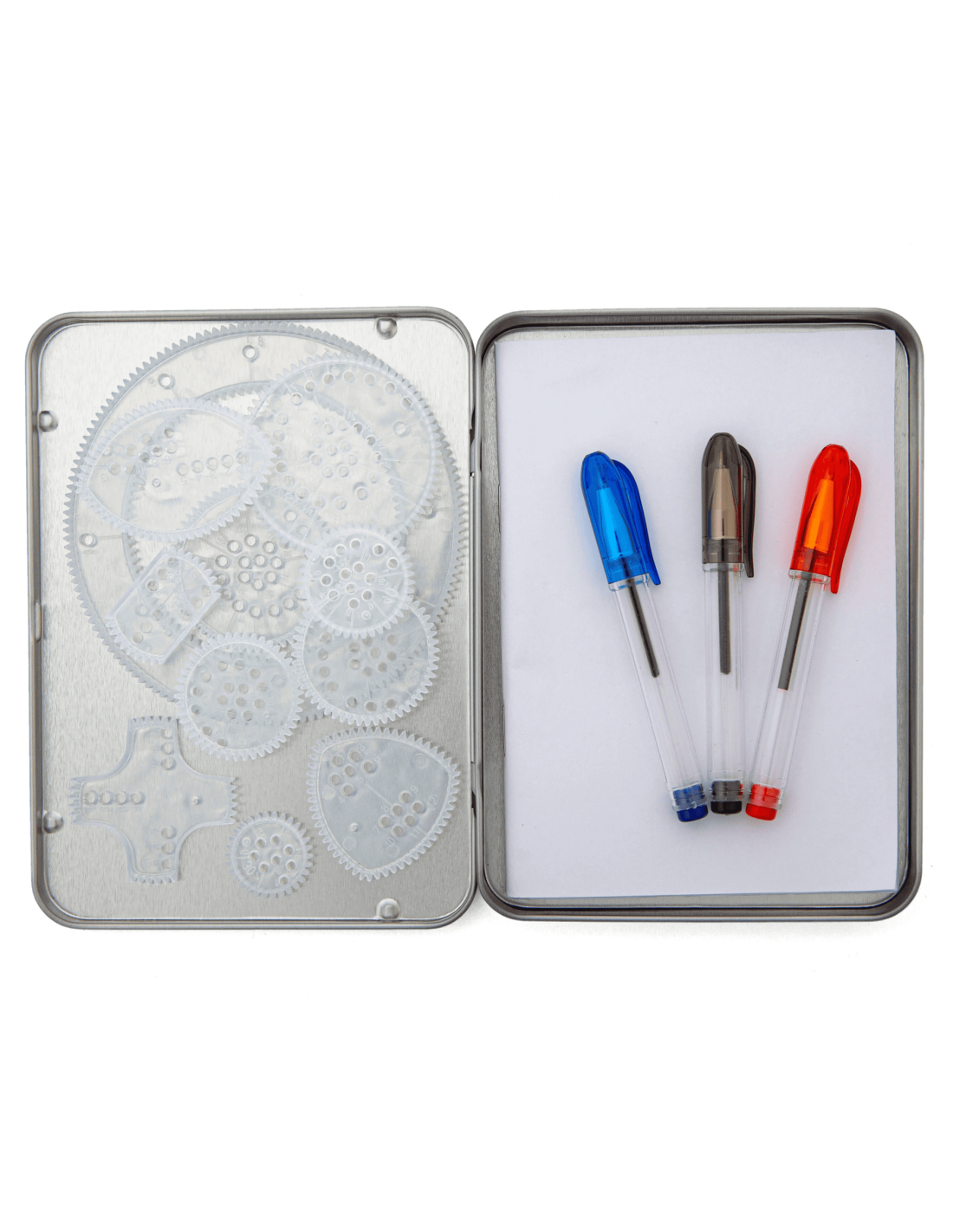 Kikkerland nous propose un loisir créatif original avec cette boite en métal nomade bien pratique : Retrouvez un carnet de feuilles blanches, trois stylos (bleu, rouge et noir) et 11 roues à dents.